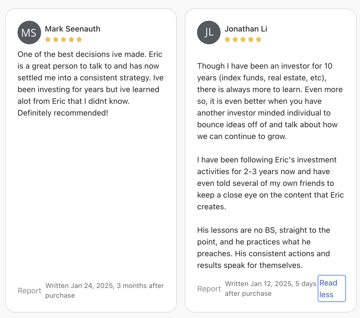 "As a golf instructor in NYC, I was never taught how to properly invest my money. Eric has been an incredible mentor during my first year of investing. He's always available when I need help, walking me through confusing markets step-by-step. With his guidance on what to look for and how to interpret current events, I've had a very successful first year investing. I highly recommend Eric to anyone looking to build their financial knowledge."